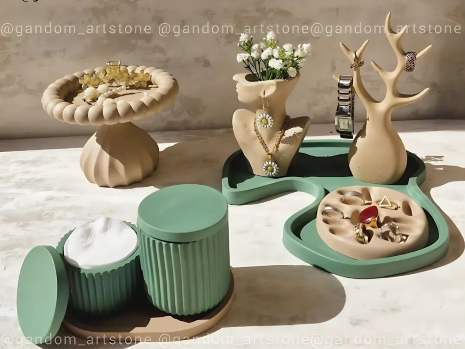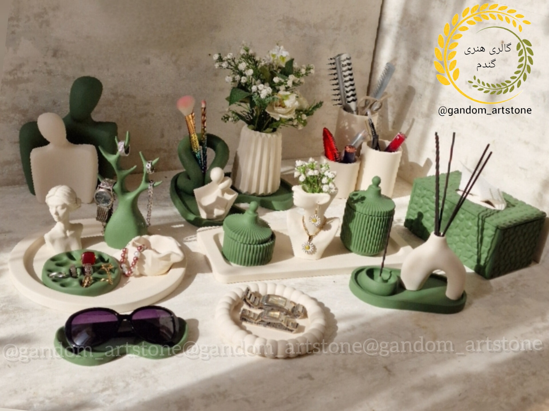 ست دکوری نظم دهنده میز آرایش 28 تیکه با ترکیب دو رنگ کرم استخونی و سبز