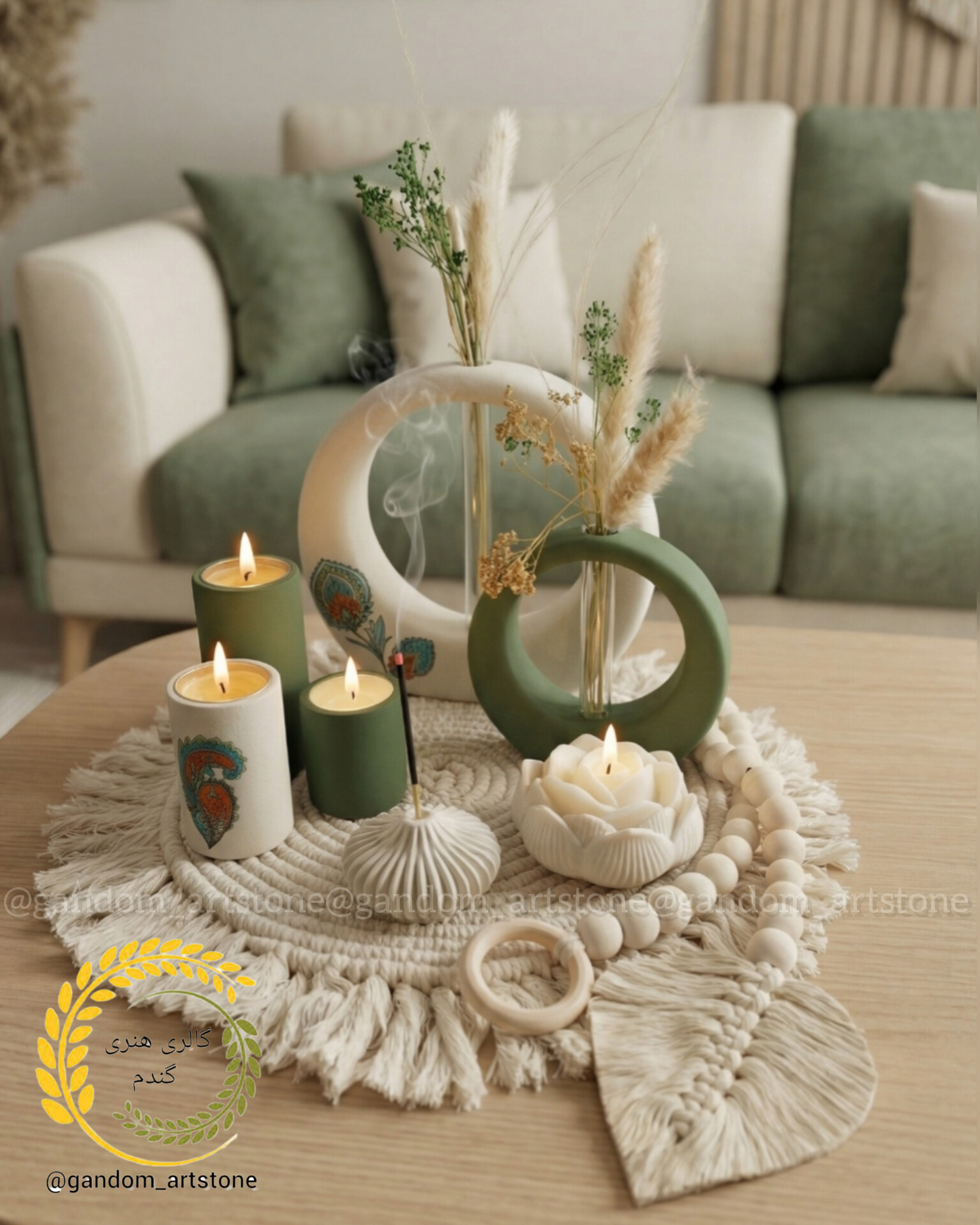 ست کامل دکوراتیو به همراه شمع و گل خشک رانر و تسبیح دکوراتیو