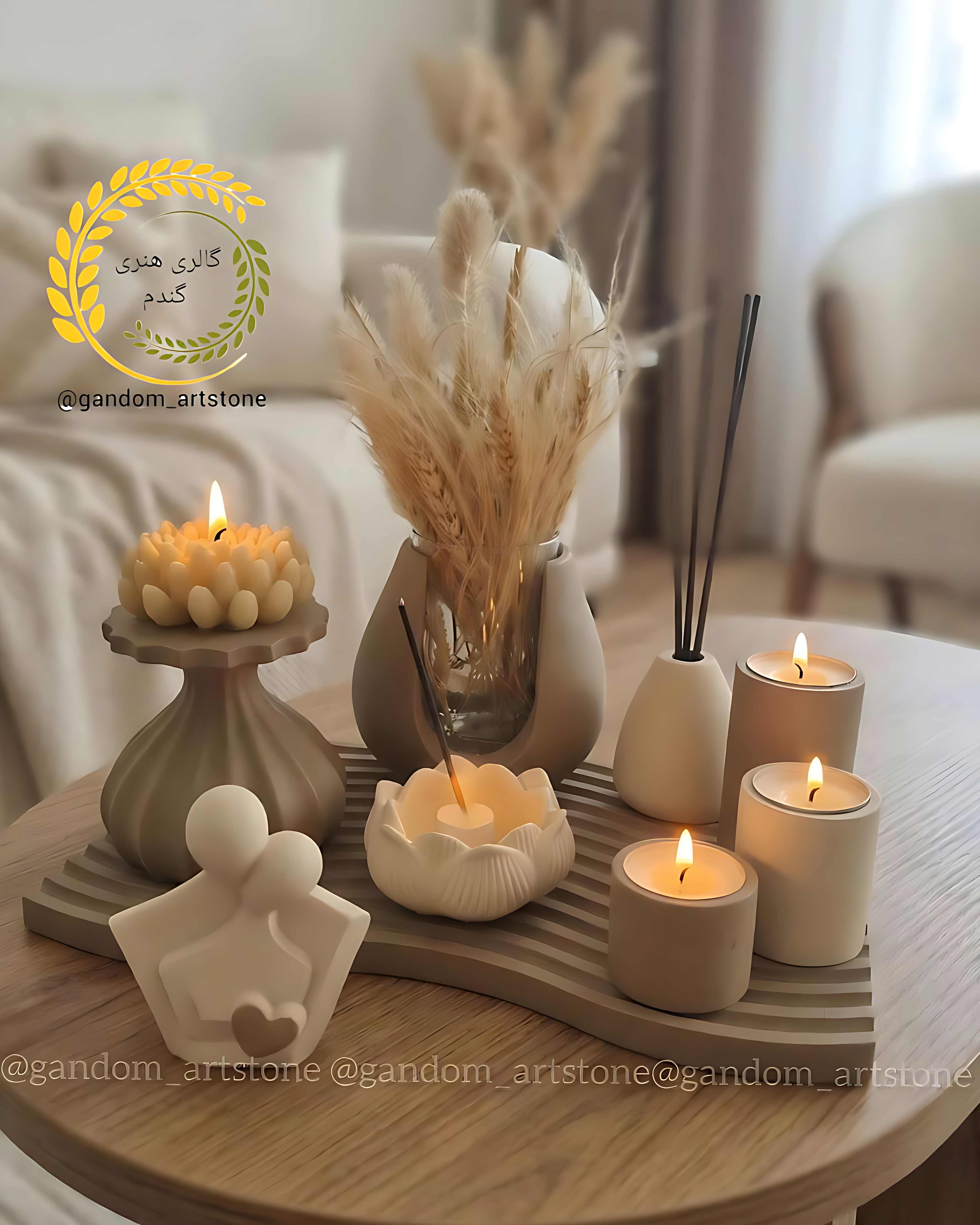 ست کامل دکوری بهمراه شمع و گل خشگ تسبیح دکوراتیو و رانر و آباژور