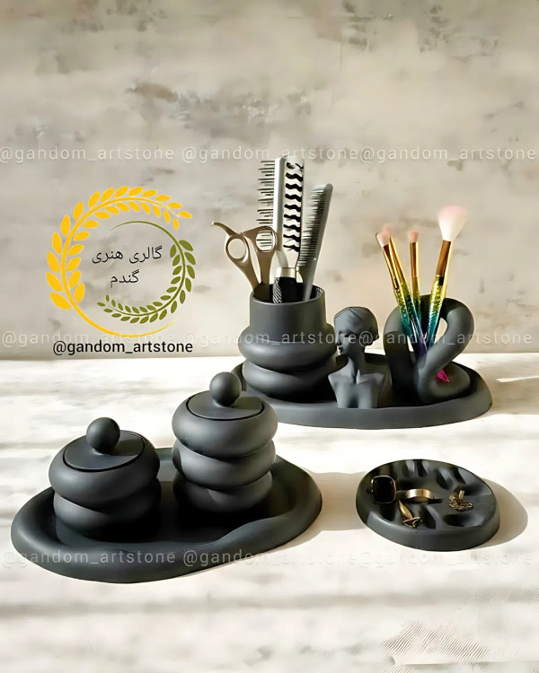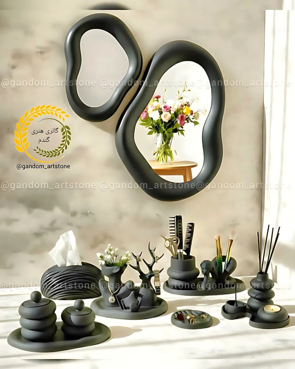 رنگ مشکی جذاب طرح ست نظم دهنده میز آرایش شامل آینه و سینیهای بیضی.
