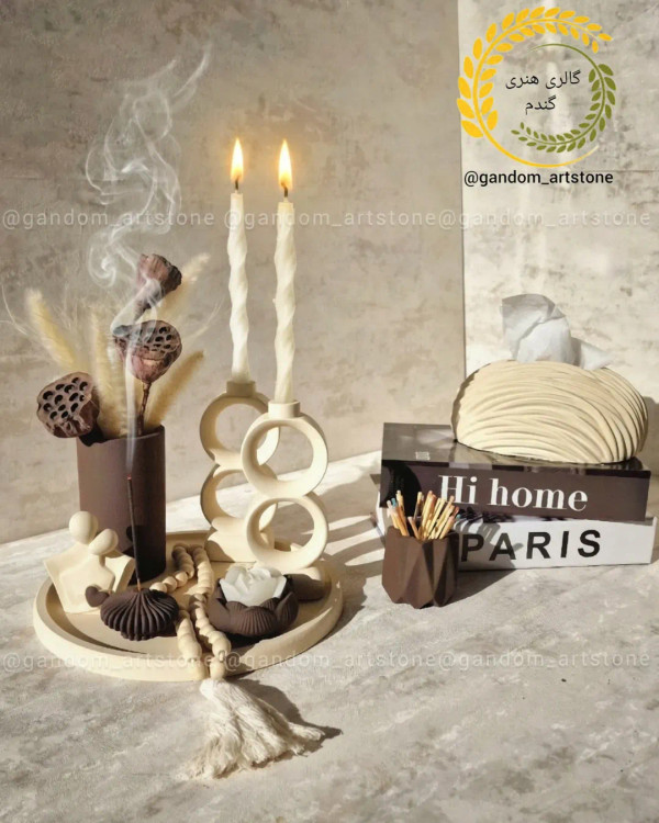 ست دکوری کامل دکوراتیو با شمع و گل خشک و تسبیح با جاکبریتی کبریت و جادستمال کاغذی