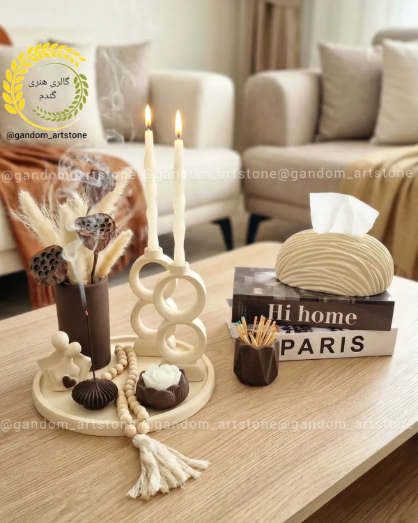 ست کامل با شمع ها، گل خشک و تسبیح دکوراتیو. جا کبریتی و جا دستمال کاغذی. ارسال با تضمین سلامت و کیفیت. انتخاب رنگ به سلیقه مشتری.