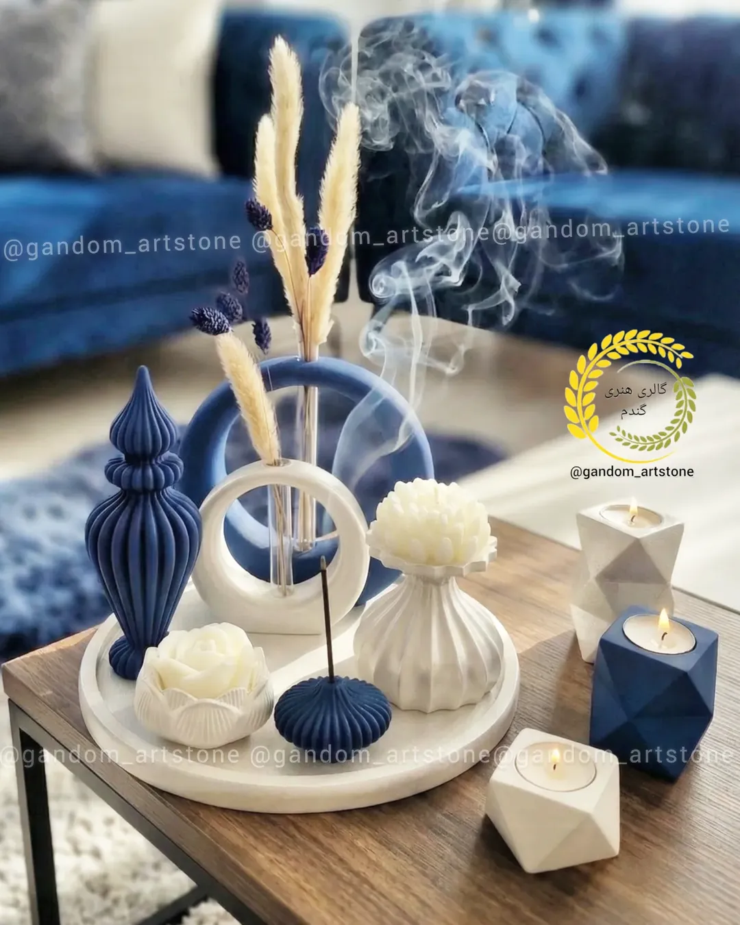 ترکیب دو رنگ سفید صدفی و آبی درباری با شمع ها و گل خشک. انتخاب رنگ به سلیقه مشتری قابل اجرا به هر رنگی که بخواین.