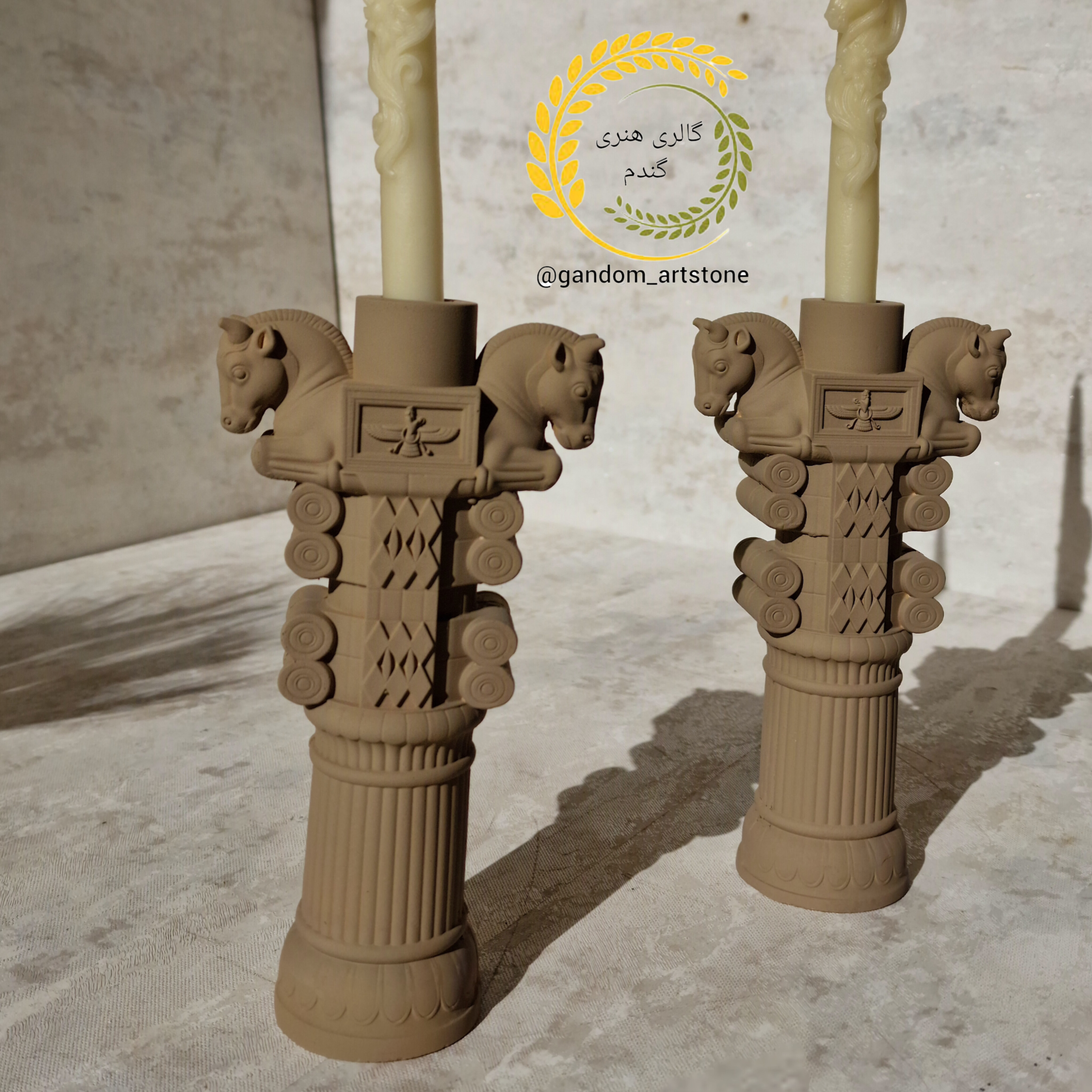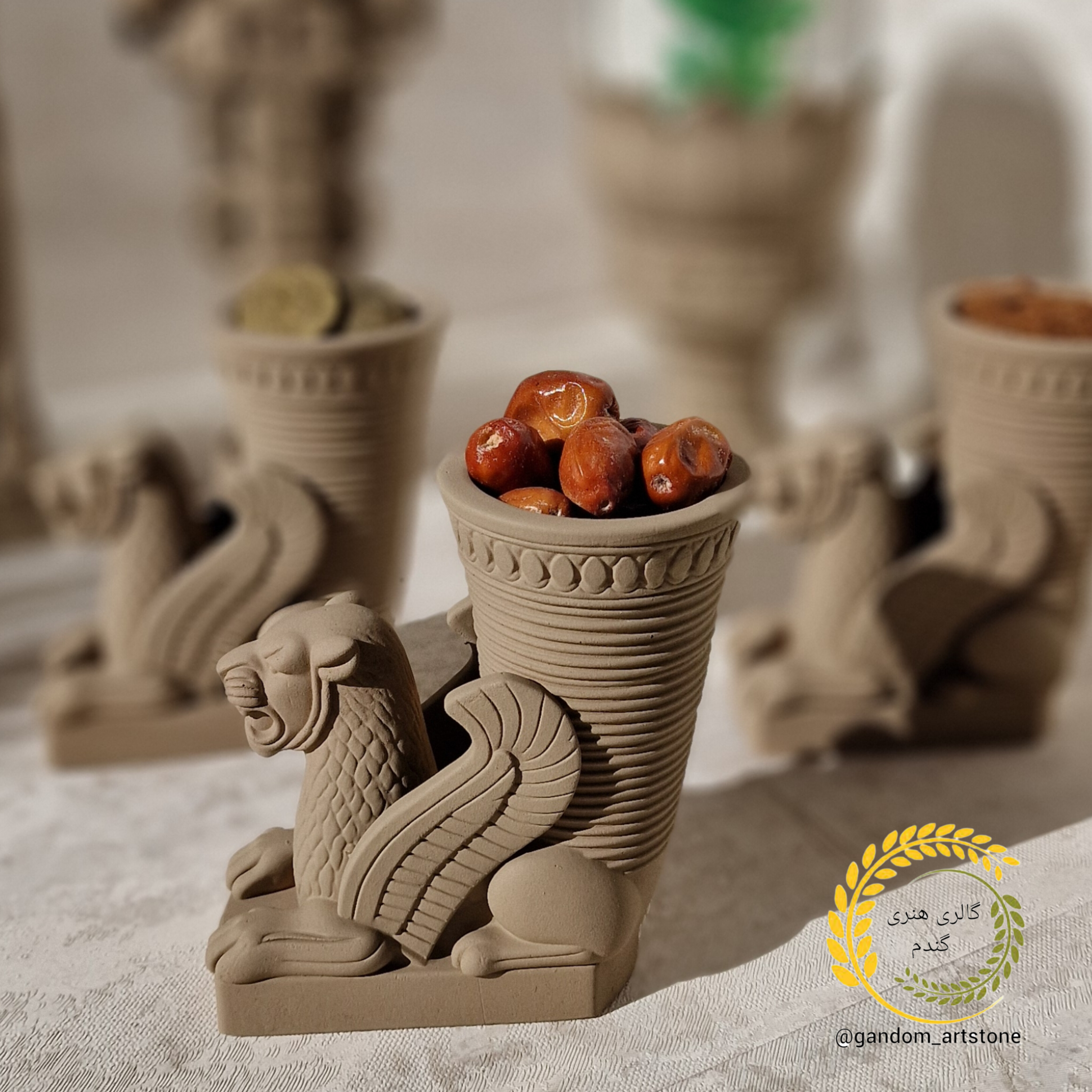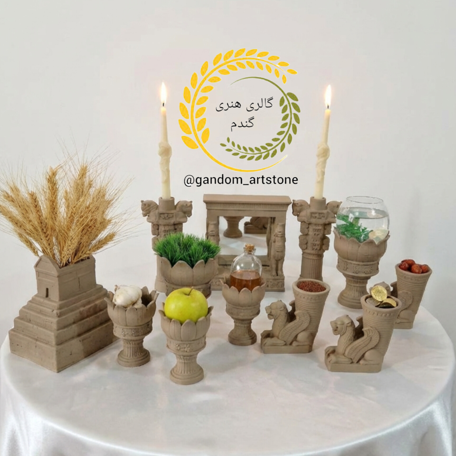 دستهبندی: ست هفت سینهفت سین هخامنش دوازده تیکه بتنی به همراه تنگ شیشه ای جفت شمع قلمی و گندم خشک: ست