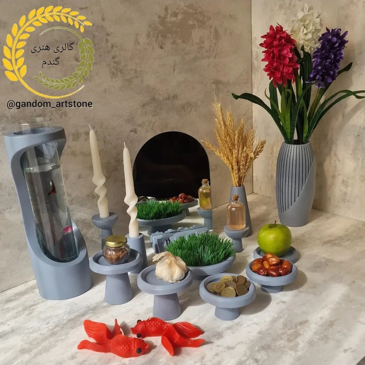 هفت سین 13 تیکه بتنی بهمراه تنگ شیشه ای بطری سرکه گندم خشک و جفت شمع قلمی و آینه