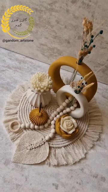 ست دکوری دکوراتیو شامل شمع ها، گل خشک، تسبیح و رانر مکرومه