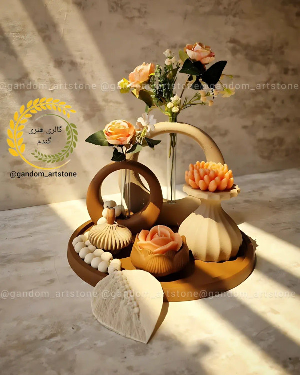 ست دکوری شامل شمع و تسبیح و گل مصنوعی