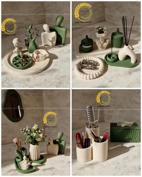 ست نظم دهنده میز آرایش با ترکیب دو رنگ کرم اسفارشستخونی و سبز شامل چندین قسمت برای نگهداری لوازم آرایش و زیورآلات است.