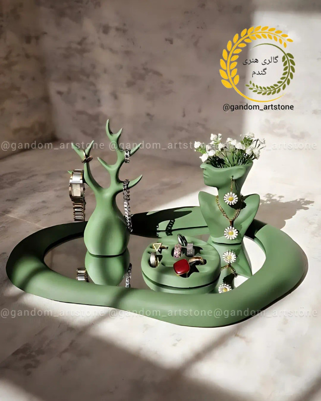 ست کامل شامل استند دفورمه کف آینه با ابعاد ۲۸در ۴۰ سانت، جاجواهری درختی، گلدون و جا جواهری رخ و جا انگشتر پینترستی. انتخاب رنگ به سلیقه مشتری.