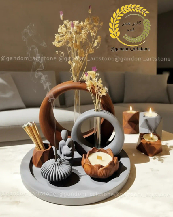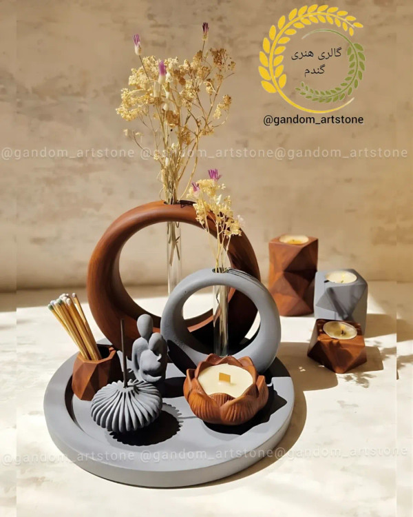 ست دکوری هفت تیکه جاشمعی سه تایی چند وجهی با گل خشک و کبریت پایه بلند
