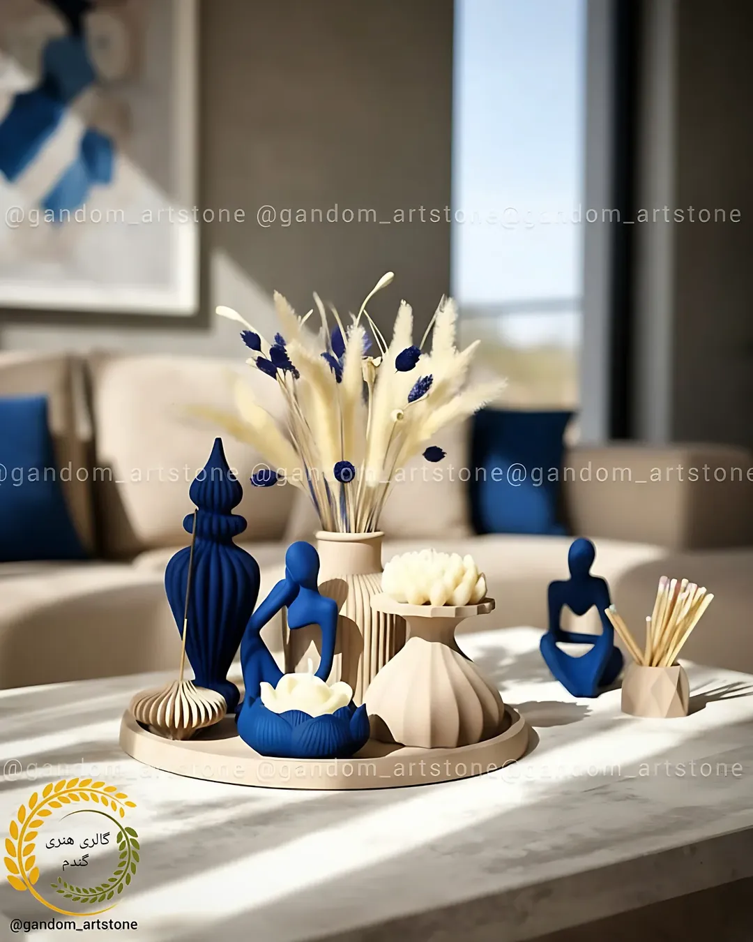 ست دکوری مناسب جلو مبلی عروس ترکیب دو رنگ کرم نسکافه ای و آبی درباری
